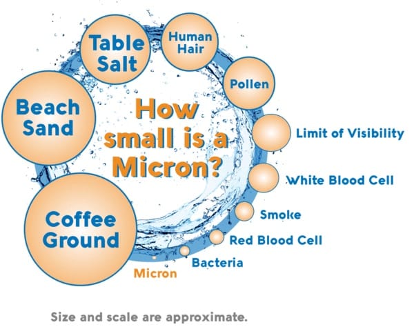 A micron is short for one micrometer, or one-millionth of a meter. The pores of a 20-micron filter are double the size of a 10-micron filter and best for large debris. Any particle smaller than 35 microns is too small to see without a microscope. The particles filtered from a 25, or 20, or 10 are invisible to the naked eye.