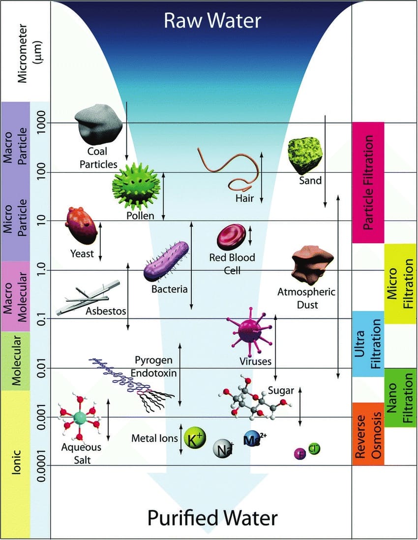 Micron filters remove dirt, debris, and even microscopic particles from water. The pore size of a filter cartridge is measured in microns. The smaller the micron rating, the finer the particulate removed. Which size micron filter you need depends on the size of the smallest particle that needs filtering from your water. A 5-micron filter, for example, removes particles as small as 5 microns. Anything smaller passes through the pores. Sediment filters are the most common type of micron filter. Sediment filters are similar to screen doors that allow air in and keep bugs out, except the debris blocked by the filter is microscopic.